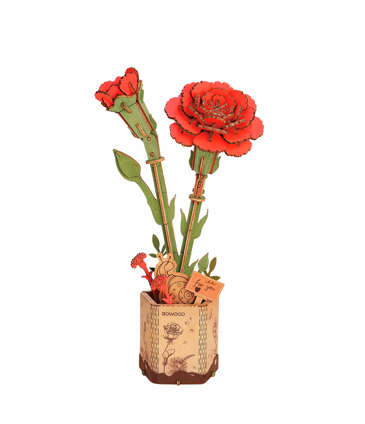 - Robotime-Rowood Red Carnation är en dekorativ träblommbukett som för med sig färg och elegans till alla rum.